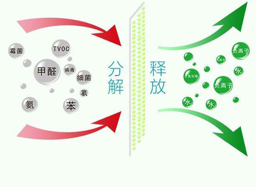 光觸媒在光照射下,光觸媒能吸收相當于帶隙能量以下的光能,使其表面發生激勵而產生電子和空穴。這些電子和空穴具有很強的還原和氧化能力,能與水或容存的氧反應,產生氫氧根自由基和超級陰氧離子。就是通過這些離子產生的化學效應把空氣中存有的甲醛去除。且在噴過的提防,光觸媒會形成一層鍍膜,只要不是用力擦去,基本上光觸媒能夠存留很長的時間,能夠一直不斷的去除剩余甲醛。